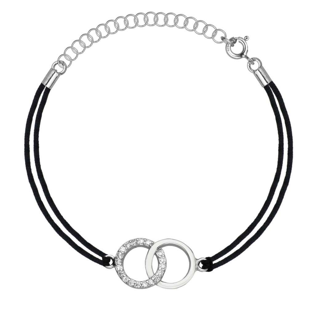 Srebrna Bransoletka na Podwójnym Czarnym Sznurku z Przeplatanymi Kółkami i Cyrkoniami 925