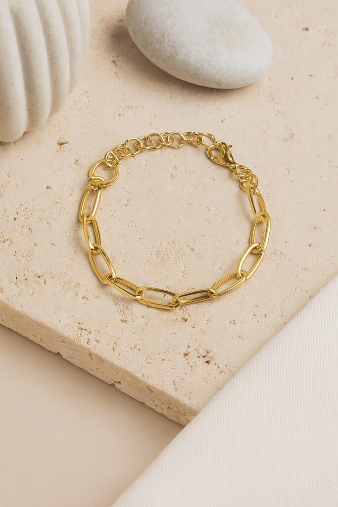 Złocenie nadaje bransoletce elegancki, ciepły blask, a solidne wykonanie i klasyczne zapięcie gwarantują wygodę noszenia i trwałość przez długi czas. Bransoletka świetnie wygląda noszona solo, ale może też być bazą do tworzenia modnych zestawów.