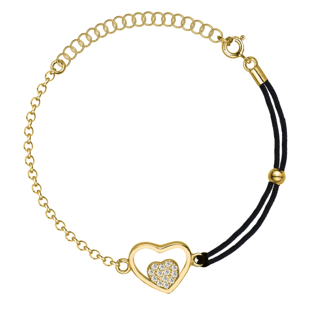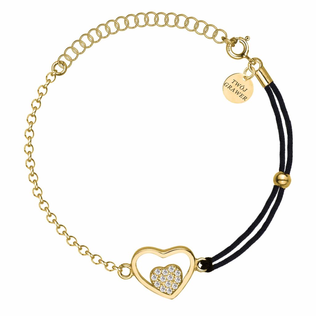 Srebrna pozłacana bransoletka wykonana ze srebra próby 925 łączy klasyczny splot typu ankier z podwójnym, czarnym sznurkiem, tworząc nowoczesny i efektowny dodatek. Centralnym elementem ozdobnym jest ażurowe serce z mniejszym serduszkiem wysadzanym błyszczącymi cyrkoniami, które przyciągają wzrok i nadają całości wyjątkowego uroku.