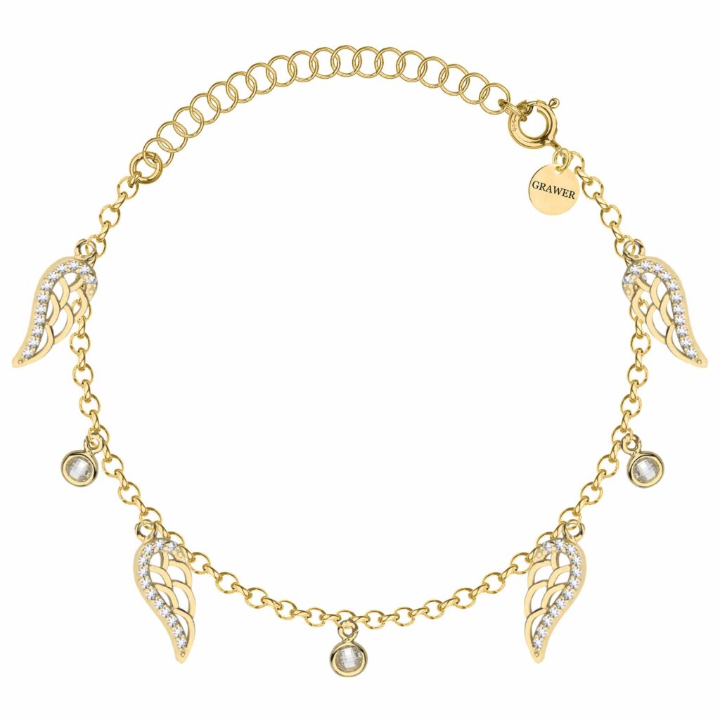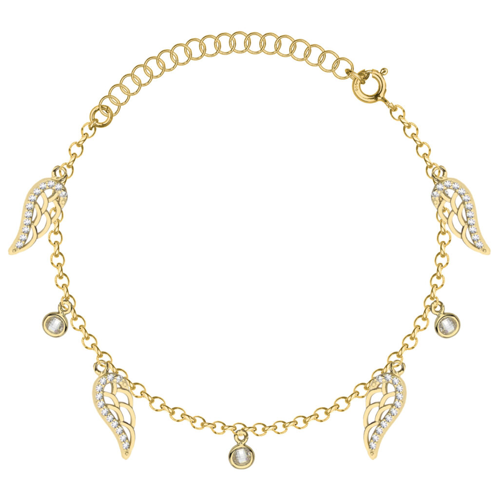 Subtelna i zjawiskowa – ta srebrna pozłacana bransoletka typu ankier to propozycja dla kobiet, które kochają romantyczne i symboliczne motywy. Delikatny łańcuszek o szerokości 1,1 mm zdobią zawieszki w formie skrzydeł wysadzanych cyrkoniami oraz błyszczące, okrągłe kamienie w oprawach. Skrzydła symbolizują wolność, ochronę i duchowe piękno, a ich złocony blask dodaje całości lekkości i wyjątkowego uroku. To idealny dodatek zarówno na co dzień, jak i na wyjątkowe okazje – pełen wdzięku i znaczenia.