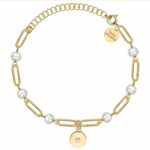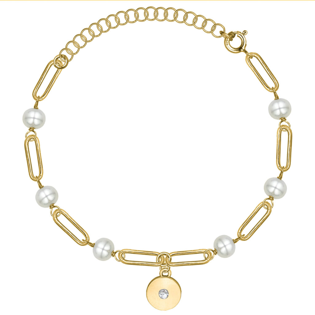 Srebrna Pozłacana Bransoletka Ankier z Perełkami i Okrągłą Zawieszką 925 585 – 3,3 mm