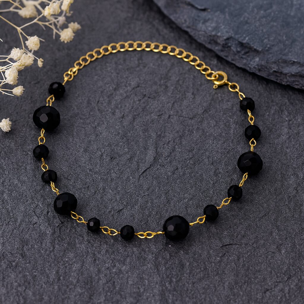 Nowoczesna elegancja w złotym wydaniu! Ta srebrna pozłacana bransoletka z naturalnymi czarnymi kamieniami to efektowna biżuteria, która podkreśla wyjątkowy styl i charakter. Kamienie o fasetowanej powierzchni przepięknie kontrastują z ciepłym odcieniem złota, dodając całości głębi i luksusowego blasku. Subtelny łańcuszek o szerokości 1,7 mm oraz staranne wykonanie sprawiają, że bransoletka doskonale prezentuje się na nadgarstku i pasuje zarówno do codziennych, jak i wieczorowych stylizacji. Idealna dla kobiet, które cenią niebanalne dodatki.