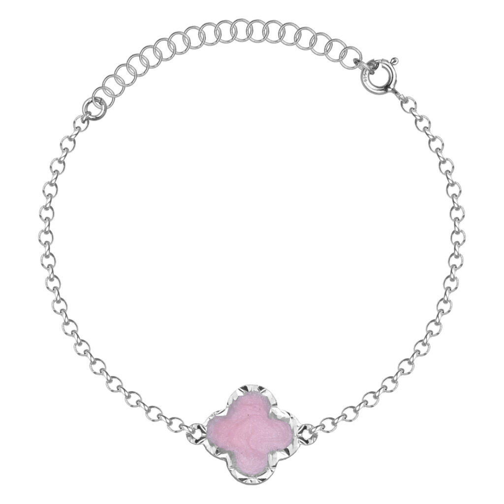 Srebrna rodowana bransoletka typu ankier o szerokości 2 mm z różową koniczynką, wykonana z najwyższej jakości srebra próby 925, to subtelna biżuteria o wyjątkowym znaczeniu. Symbol czterolistnej koniczynki, uznawany za talizman szczęścia i pomyślności, został wykonany z różowego kamienia naturalnego w ozdobnej oprawie, nadając bransoletce delikatnego, kobiecego charakteru.