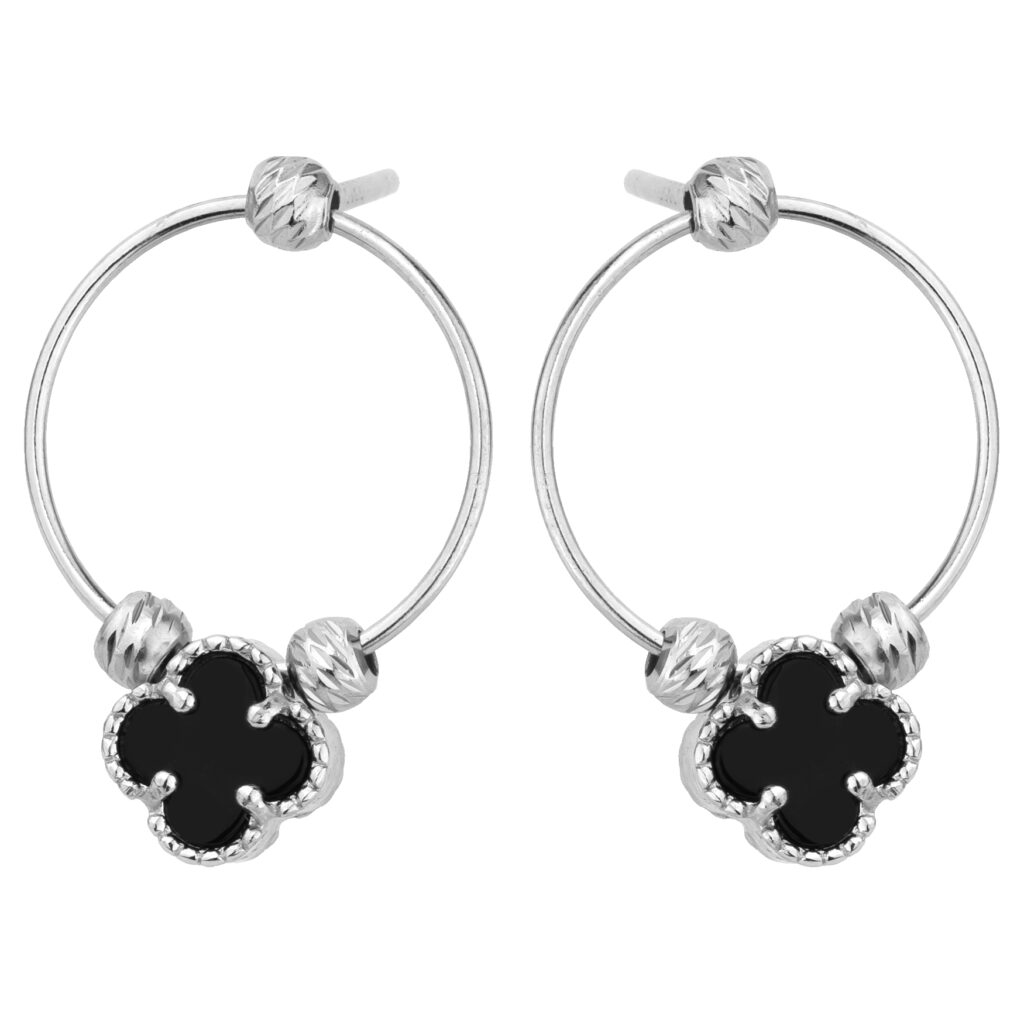 Stylowe kolczyki w formie delikatnych kół z ozdobną zawieszką w kształcie koniczynki z czarnym kamieniem naturalnym to idealna propozycja dla kobiet ceniących elegancję z nutą symboliki. Wykonane ze srebra próby 925 i pokryte warstwą rodu, zachwycają precyzją detalu i subtelnym połyskiem. Symbol szczęścia w nowoczesnym wydaniu sprawia, że to nie tylko biżuteria, ale i amulet.