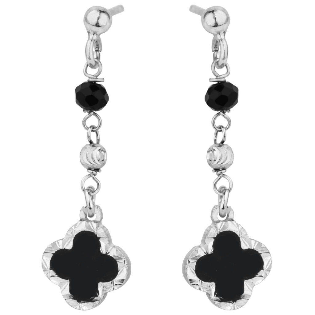Eleganckie kolczyki wiszące wykonane ze srebra próby 925, pokryte warstwą rodu, zachwycają subtelną formą i wyrafinowaną symboliką. Zawieszka w kształcie koniczynki z czarnym kamieniem naturalnym oraz dodatkowe ozdobne detale nadają biżuterii głębi i charakteru. To połączenie klasyki z nowoczesnością, które idealnie sprawdzi się zarówno na co dzień, jak i przy wyjątkowych okazjach.
