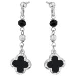 Srebrne Rodowane Kolczyki Wiszące Koniczynka z Czarnymi Kamieniami Naturalnymi 925