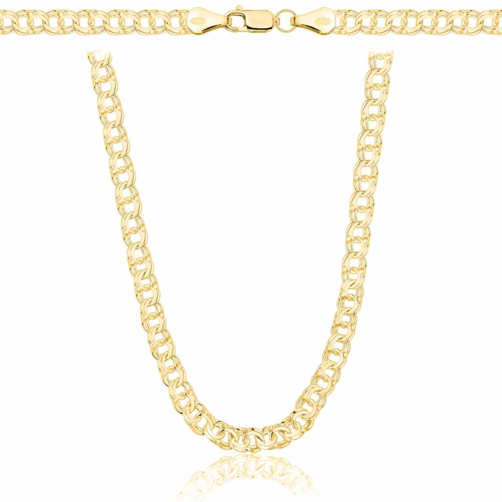 Szerokość 4,5 mm sprawia, że łańcuszek jest wyrazisty, ale wciąż elegancki, co czyni go idealnym dodatkiem dla osób, które cenią sobie biżuterię z nutą luksusu. Proces pozłacania odbywa się za pomocą kąpieli złotniczych z użyciem najwyższej jakości preparatów galwanicznych, co zapewnia trwałą i równomierną warstwę złota, która zachowuje swój blask przez długi czas. Solidna konstrukcja gwarantuje, że łańcuszek pozostanie piękny i wytrzymały, oferując luksusowy wygląd na lata.