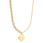 Centralna zawieszka w kształcie serca z motywem kłódki przyciąga wzrok i symbolizuje uczucia, relacje lub własne wartości, które chcemy zatrzymać blisko siebie. Ciepły odcień złota 585 podkreśla elegancję naszyjnika i sprawia, że doskonale prezentuje się zarówno jako element codziennej stylizacji, jak i biżuteria na specjalne okazje.
