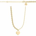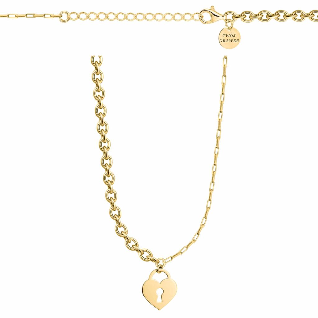 Pozłacany srebrny naszyjnik Ankier z zawieszką w kształcie serca-zamka, wykonany z najwyższej jakości srebra próby 925 i pokryty trwałą warstwą złota 585, to nowoczesna biżuteria o wyrazistym stylu i wyjątkowym przesłaniu. Połączenie dwóch kontrastujących splotów – jednego masywniejszego o szerokości 5 mm i drugiego subtelniejszego 2,2 mm – nadaje kompozycji unikalnego, modowego charakteru.