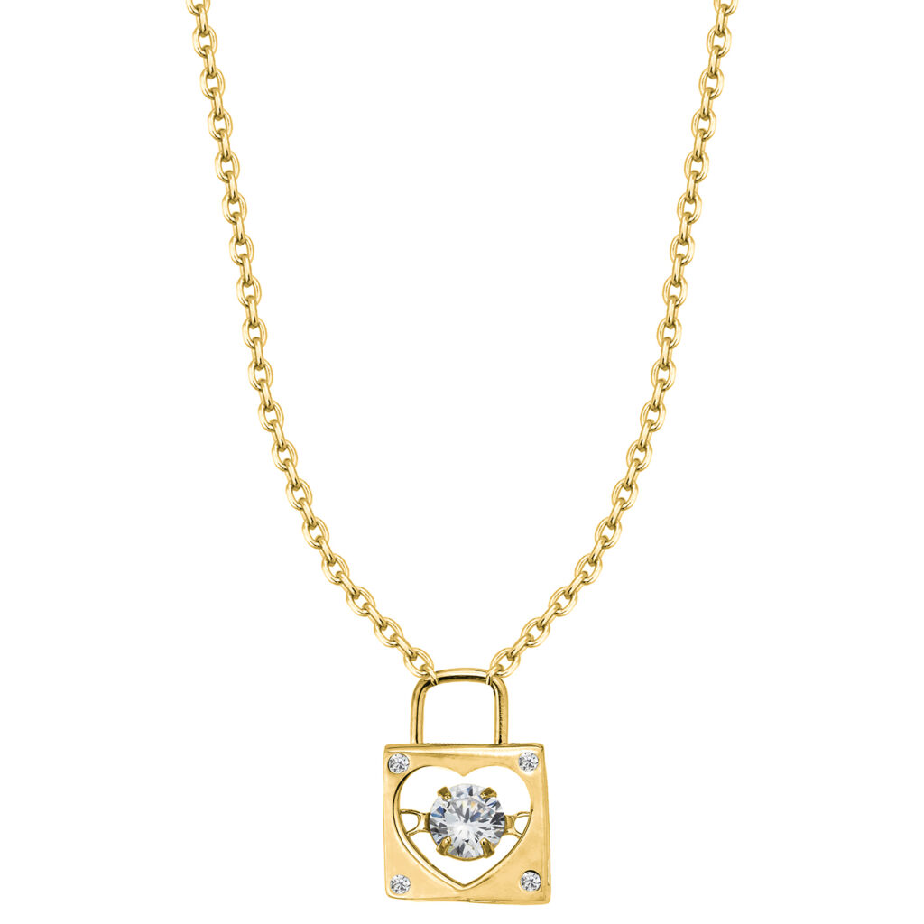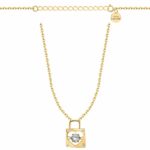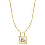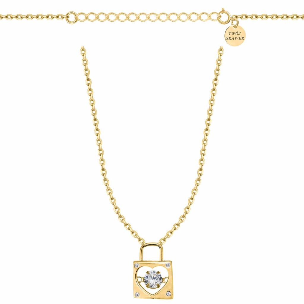 Pozłacany srebrny naszyjnik typu ankier z zawieszką w kształcie kłódki, wykonany ze srebra próby 925 i pokryty warstwą złota 585, to elegancka biżuteria z romantycznym przesłaniem. Kłódka z ażurowym motywem serca kryje w sobie centralnie osadzoną cyrkonię, która efektownie odbija światło, a cztery drobne kamienie w narożnikach dodają jej subtelnego blasku.