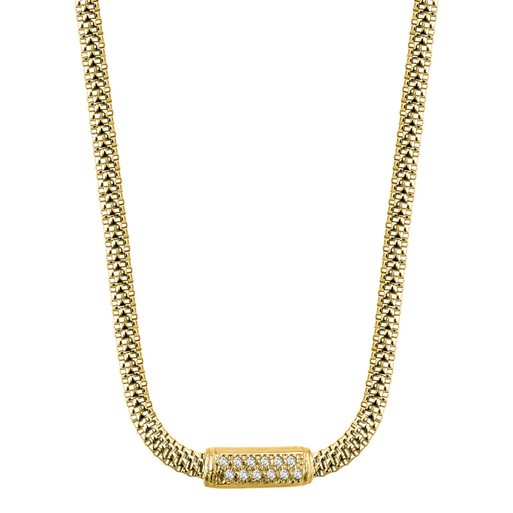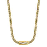 Pozłacany srebrny naszyjnik o splocie TUB z ozdobnym ogniwem wysadzanym cyrkoniami, wykonany z najwyższej jakości srebra próby 925 i pokryty warstwą złota 585, to elegancka biżuteria o nowoczesnym charakterze i luksusowym wykończeniu. Splot TUB o szerokości 3 mm tworzy zwartą, elastyczną strukturę, która efektownie układa się na dekolcie i dodaje stylizacji wyrazistości.