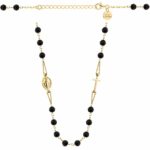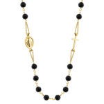 Pozłacany srebrny naszyjnik z czarnymi kamieniami naturalnymi, krzyżykiem i medalikiem, wykonany z najwyższej jakości srebra próby 925 i pokryty trwałą warstwą złota 585, to elegancka biżuteria o duchowym i symbolicznym charakterze. Połączenie złoconego wykończenia z głęboką czernią naturalnych kamieni tworzy wyjątkowy kontrast, który podkreśla unikalny, ponadczasowy styl.