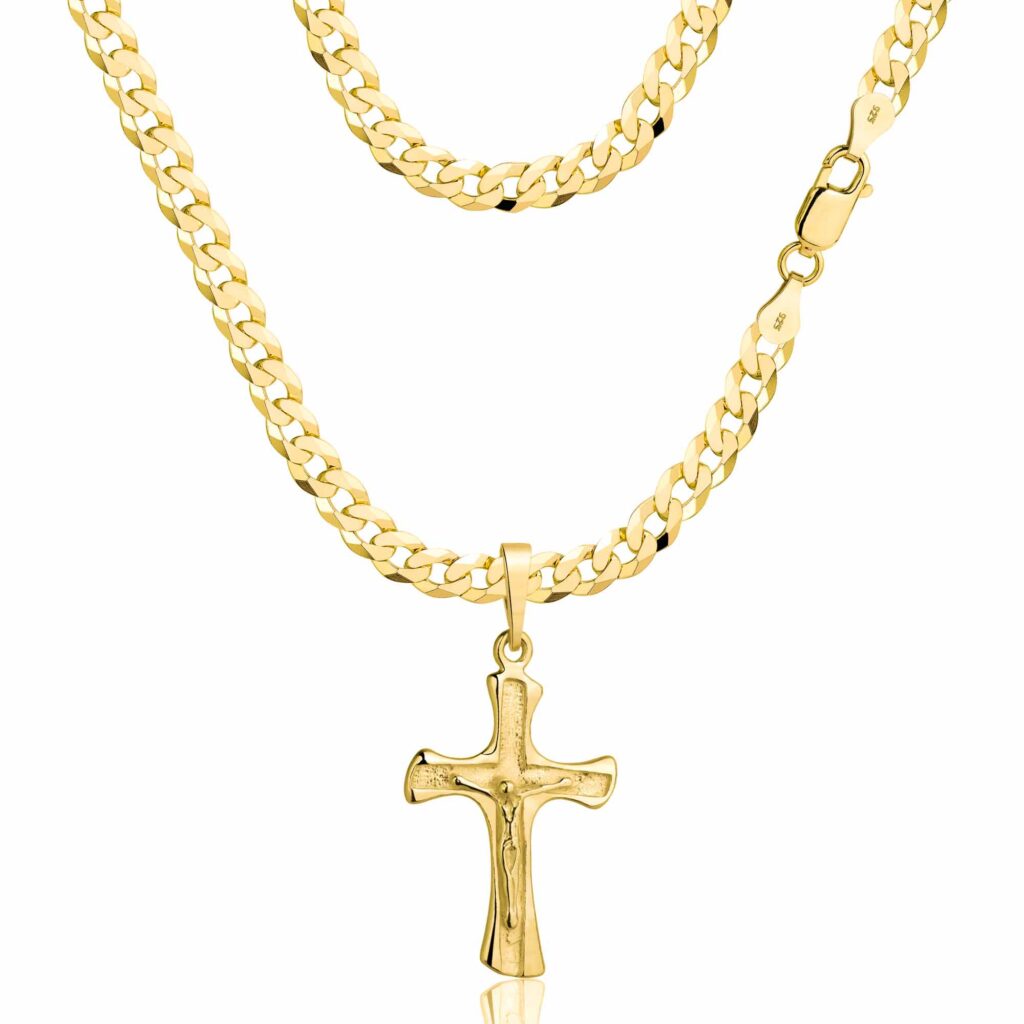 Pozłacany srebrny łańcuszek Pancerka próby 925 585 o szerokości 3,8 mm z krzyżykiem to elegancki dodatek, który łączy w sobie luksusowy styl i osobiste znaczenie. Klasyczny splot Pancerki, znany ze swojej solidności, tworzy mocną strukturę, która doskonale odbija światło, nadając biżuterii wyjątkowego blasku. Krzyżyk, zawieszony na łańcuszku, symbolizuje wiarę i ochronę, co czyni ten element biżuterii szczególnie istotnym.
