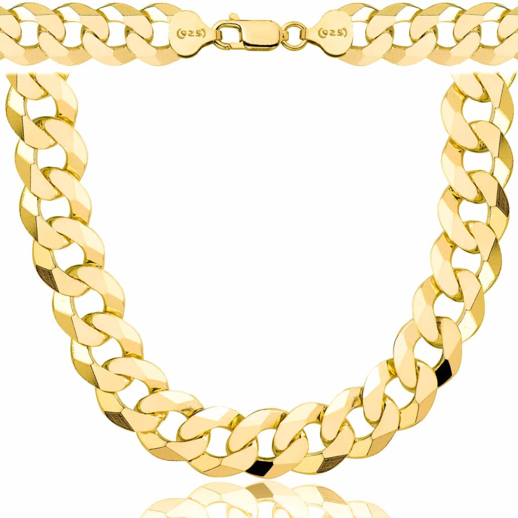Szerokość 10,5 mm sprawia, że łańcuszek jest wyrazisty, ale wciąż elegancki, co czyni go idealnym dodatkiem dla osób, które cenią sobie luksus z klasą. Proces pozłacania odbywa się z użyciem kąpieli złotniczych oraz najwyższej jakości preparatów galwanicznych, co zapewnia trwałą i równomierną warstwę złota, która zachowuje swój blask przez długi czas. Solidna konstrukcja sprawia, że łańcuszek pozostanie piękny i wytrzymały, oferując luksusowy wygląd na lata.