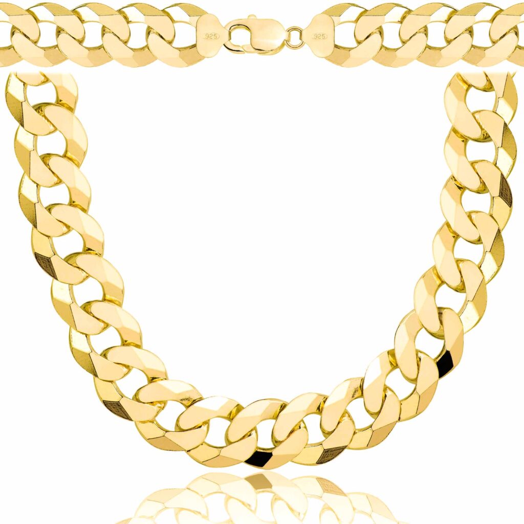 Szerokość 14,3 mm sprawia, że łańcuszek jest wyrazisty, ale wciąż zachowuje elegancję, co czyni go idealnym wyborem dla osób, które lubią wyróżniać się stylowymi i mocnymi dodatkami. Proces pozłacania odbywa się z użyciem kąpieli złotniczych oraz najwyższej jakości preparatów galwanicznych, co zapewnia trwałą i równomierną warstwę złota, która zachowuje swój blask przez długi czas. Solidna konstrukcja sprawia, że łańcuszek jest nie tylko piękny, ale także wytrzymały, oferując luksusowy wygląd na lata.