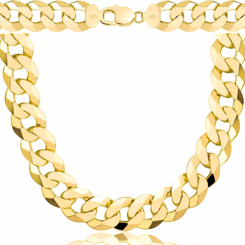 Szerokość 15,5 mm sprawia, że łańcuszek jest odważny i przyciągający wzrok, co czyni go idealnym dodatkiem dla osób, które lubią wyróżniać się stylowymi i mocnymi akcentami. Proces pozłacania odbywa się z użyciem kąpieli złotniczych oraz najwyższej jakości preparatów galwanicznych, co zapewnia trwałą i równomierną warstwę złota, która zachowuje swój blask przez długi czas. Solidna konstrukcja sprawia, że łańcuszek jest piękny i wytrzymały, oferując luksusowy wygląd na lata.